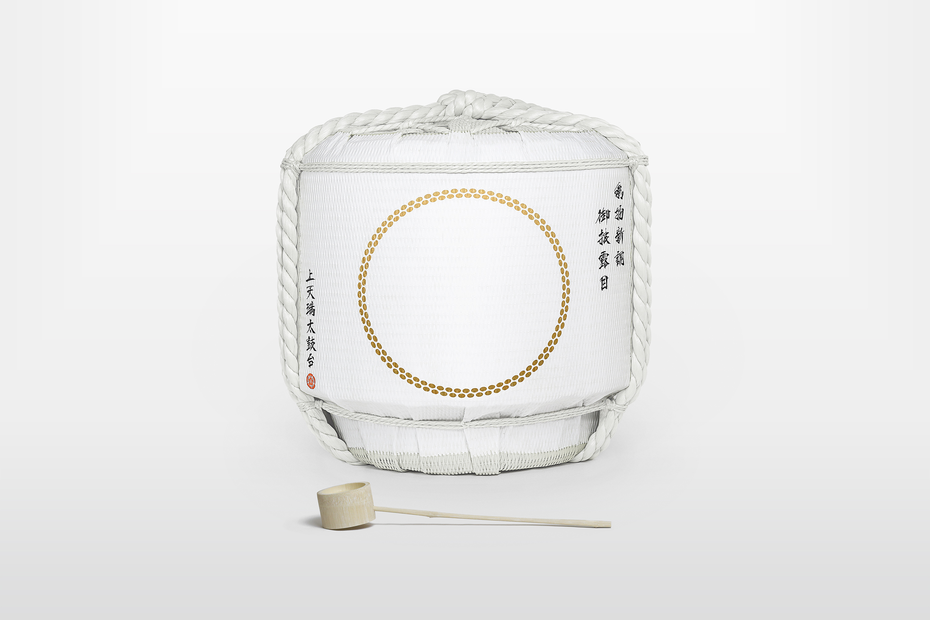 We therefore set about analyzing the materials necessary to construct the drum, paying particular attention to the rivets which would be essential for the drum's structure. The riveting, with determines the sound of the drum, was carried out with great care, and under close supervision. Our graphic design used the same number of rivets as an actual taiko drum, 150, in order to create a piece with an identity befitting of the ceremony.