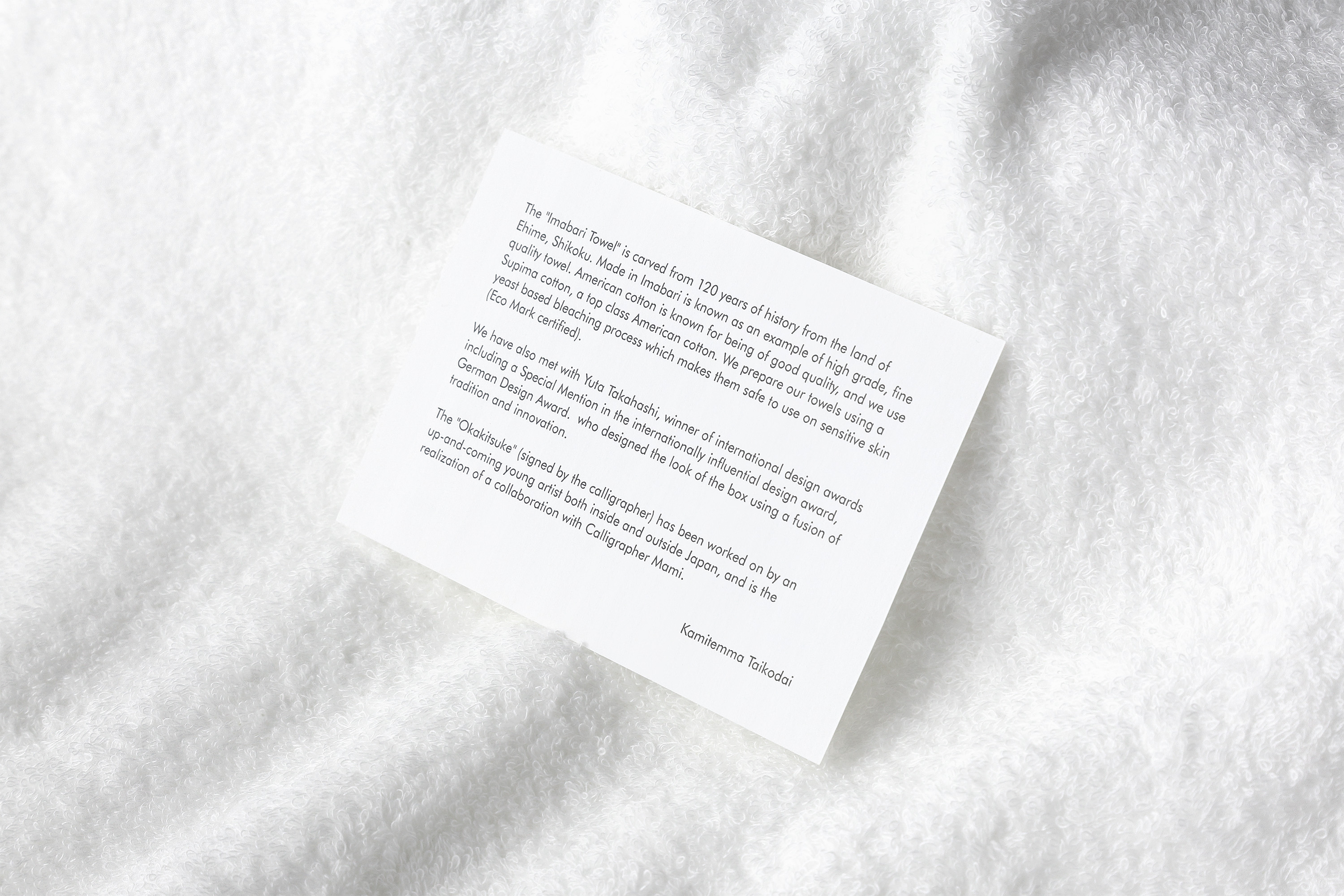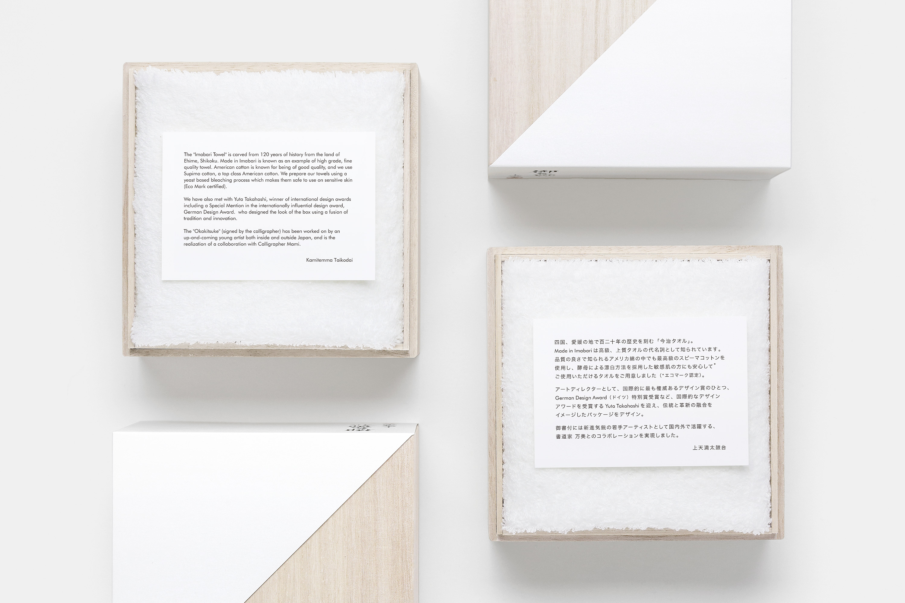 Imabari towels are a luxury gift item produced in the region which have become a byword for high-grade towels. Made using premium supima cotton, the highest grade of high-grade American cottons, the towels are bleached using a natural method involving yeast, which earns them an ecological mark. Using traditional Japanese "kiribako" paulownia boxes, we created a novel, minimalist packaging design that synthesizes tradition and innovation.